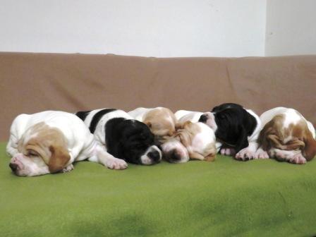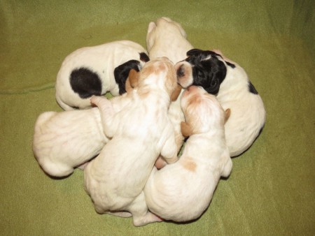 6 štěňátek - 2 fenky (bíložluté), 4 pejsci (2 černobílí, 2 bíložlutí)